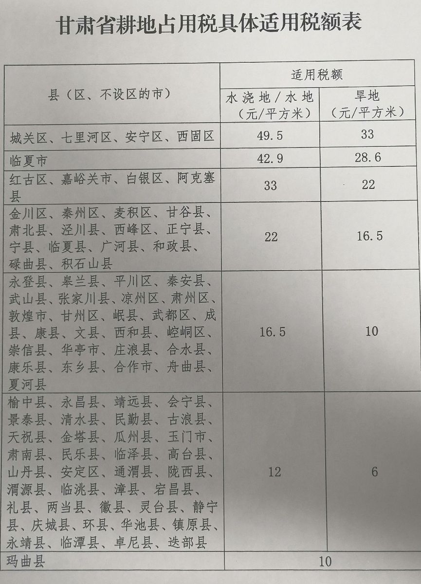 一、甘肅省耕地占用稅具體適用稅額,按照本決定所附的《甘肅省耕地占用稅具體適用稅額表》執(zhí)行。法律、法規(guī)另有規(guī)定的,從其規(guī)定。