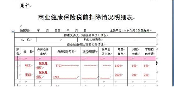 例如:張三、李四在A公司上班,每月稅前工資5000元。張三自行繳納商業(yè)健康保險1800元/年,李四自行繳納商業(yè)健康保險3600元/年,兩人均需向單位財(cái)務(wù)提供帶“稅優(yōu)識別碼”的保單憑證,單位財(cái)務(wù)人員在報稅時需要在填報《扣繳個人所得稅報告表》申報表,稅前扣除項(xiàng)—“其他”欄次,并同時填報《商業(yè)健康保險稅前扣除情況明細(xì)表》