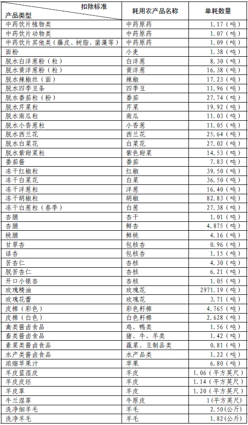 一、全省統(tǒng)一的扣除標(biāo)準(zhǔn)(農(nóng)產(chǎn)品單耗數(shù)量)